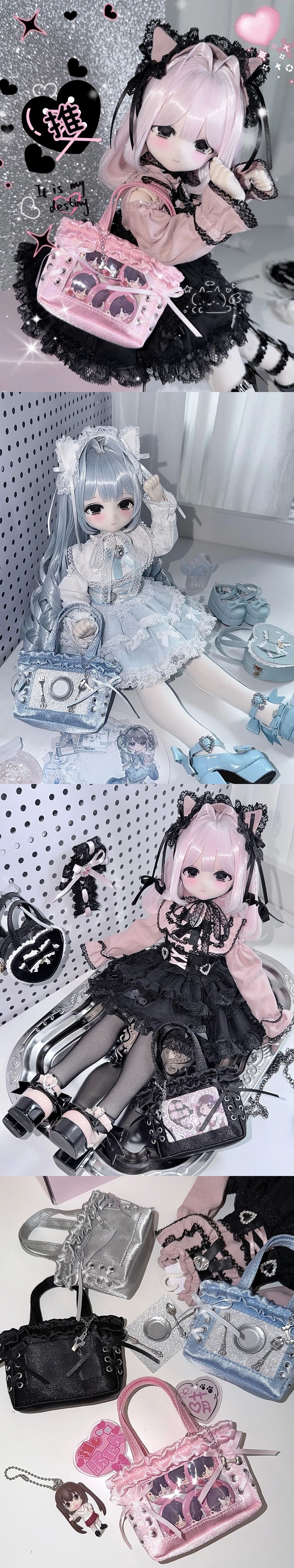 🖤ドールのコーデに欠かせないミニバッグ!光沢素材にフリルとアクセサリーが可愛らしく🍰ピンク / ブラック / 水色 / シルバーの 4 色が揃い、衣装に合わせて使い分けられます。一部モデルにはアクリルキャラクターが入っており、個性的な仕上がりです。👑💎